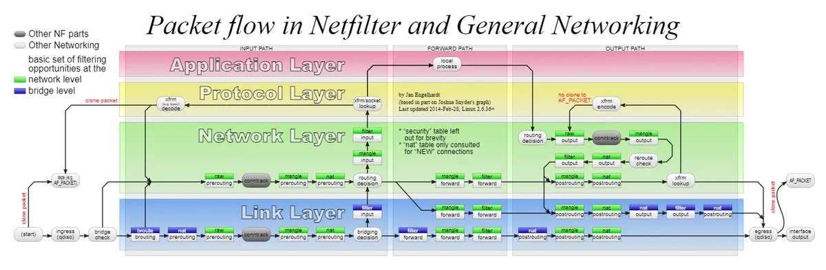 当一个数据包到达系统时,iptables 会根据其流向在相应的链中查找匹配的规则。每个数据包都必须经过多个表和链的处理,具体顺序如下: