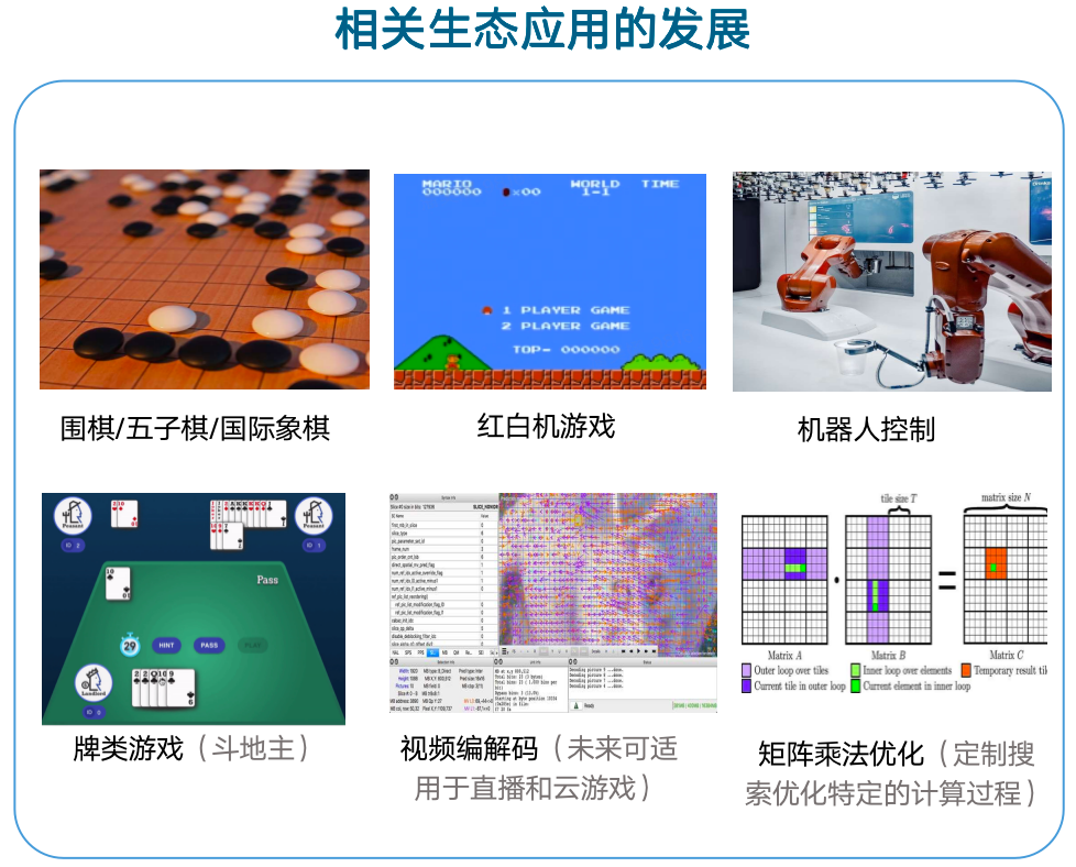 但另一方面,由于 MCTS 系列技术涉及了多种经典算法的拓展与组合,其运行模块的设计就需要包含多方面的内容,进而导致这样的窘境——即虽然算法的能力在不断进步,但是算法的应用难度却逐年升高。具体来说,其中包含强化学习分布式系统的构建,树搜索算法的高效实现和并行化,经验回放中数据的统一管理与高效增删改查操作的执行,深度神经网络的高效推理与数据并行训练等技术栈。因此,开源社区对于相关算法工具的关注度也日渐水涨船高,相继出现了 KataGo [6]、AlphaZero-General [7]、MuZero-General [8] 等一系列工具项目,不断降低 MCTS 技术的使用门槛和应用开销。不过,已有的开源项目更多偏向于棋类游戏或是入门级示例环境,仍然限制了 MCTS 类算法的应用范围,无法拓展到更多有趣或有意义的用途,研究界最新的技术成果和前沿视角也未能完全融入现有工具,导致相关技术仍然是少数研究者手中的“屠龙之术”。
