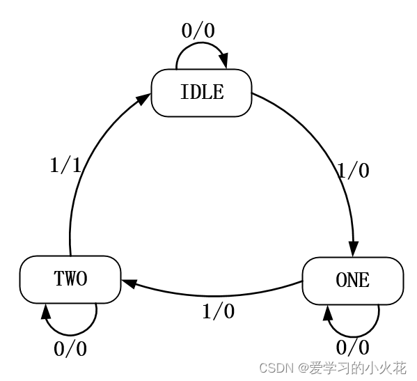 verilog设计与实现状态机-基于售货机实例 可乐机中有 0 元的状态是最原始的状态我们称之为 IDLE 状态,可乐机中有 1 元的状态我们就取名为 ONE,可乐机中有 2 元的状态取名为 TWO,可乐机中有 3元的状态取名为 THREE。了 3 元钱,但是和上面分析不同的是可乐机器此时不会立刻出可乐,此为 Mealy 状态机,输出不仅与状态有关还和输入有关,可以看到3状态后面根据不同的输入跳转了两种不同的结果。此时只需要关注输入与下一时刻的状态。3 、状态:可乐机中有 0元、可乐机中有 1 元、可乐机中有 2元、可乐机中有 3 元。
