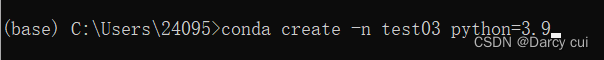 1.创建 test03 环境,输入命令:conda create -n test03 python=3.9,表示创建一个名字为test03的环境,这环境用的python版本是 3.9版本的(这里博主的python版本是3.9版本的,请根据自己的python版本进行选择)
