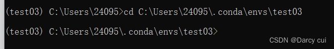 我的conda环境默认安装在C盘中,如果是在别的盘符,可使用cd转换盘符