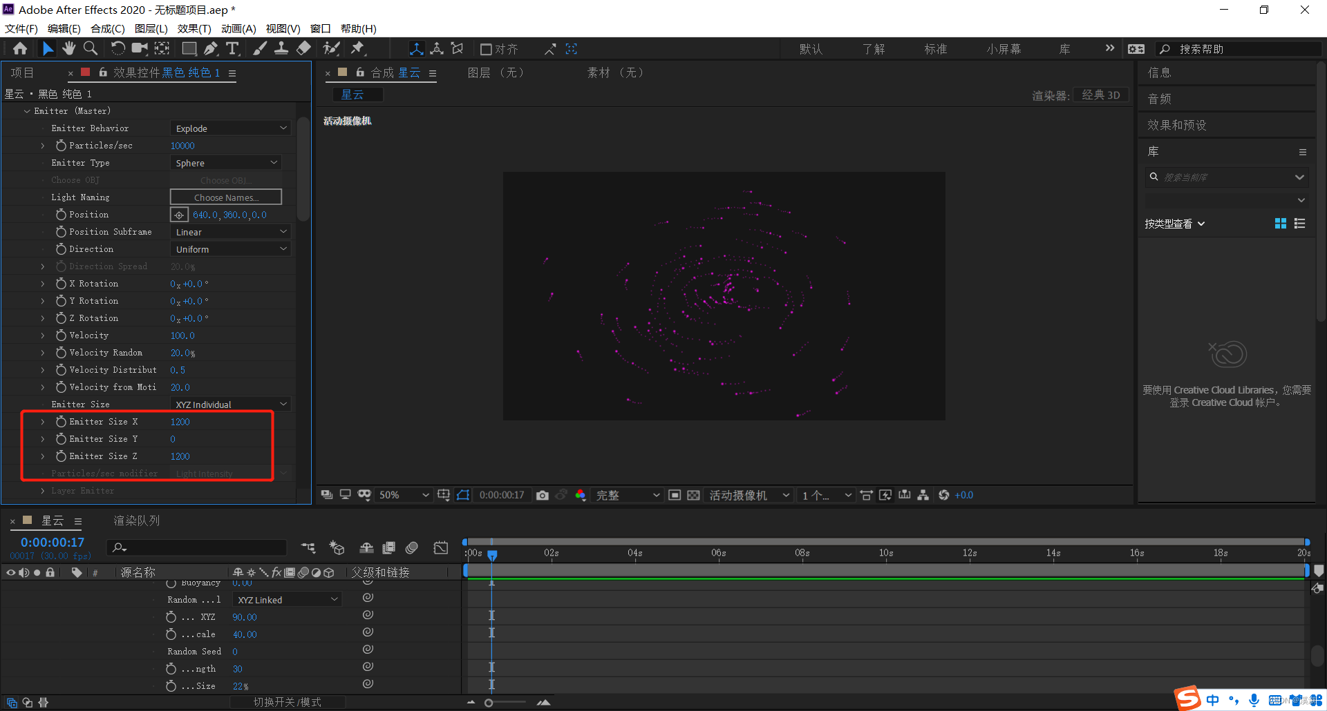 AE如何制作星云粒子特效 发射行为爆发,粒子/秒5000,发射器类型球形,发射器大小XYZ个体,X发射器大小1200,Y发射器大小0,Z发射器大小1200]物理模式流体,流体力类型管道涡流,浮力0.00,XYZ随机旋涡90.00,旋涡比例40.00,涡流强度30,涡流核心大小22%]发射连续,粒子/秒30,粒子速度20.0,生命[秒]2.5,混合模式屏幕,大小2.5,大小随机12%,继承主粒子颜色100%]2)在“时间轴面板”/“监视器面板”空白处右击->新建->纯色。...