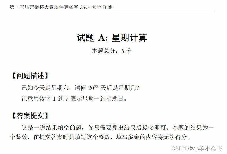 (1)这道题目给的数字是20^22,看似一个很大的数字,其实我们根本不需要跑代码就能算出答案,因为20%7=-1,所以题目就变成了(-1)^22次方为1,因为今天是星期六,所以最终答案是6+1=7.