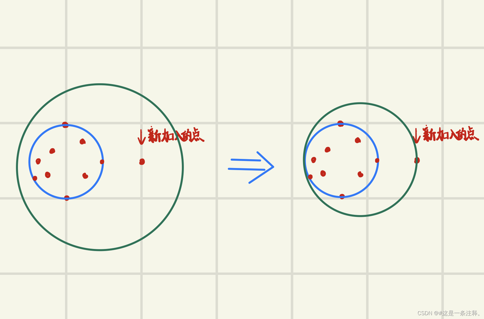 对于任意覆盖点集的圆,如果新加入的点不在边界上,那么总可以通过平移或缩放得到一个过该点还更小的圆。如下图: