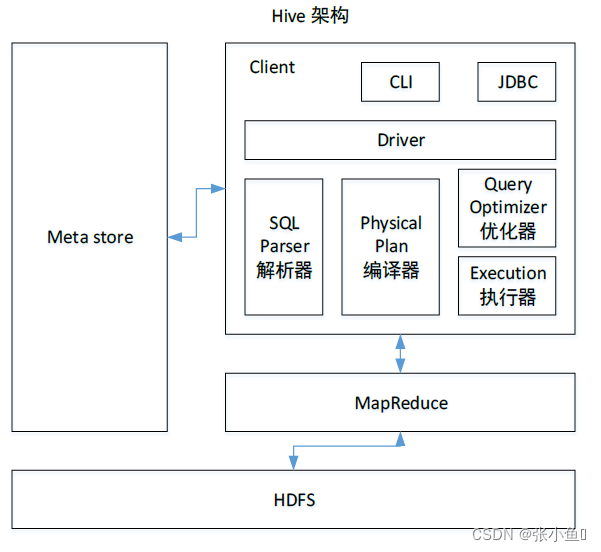 Hive 通过给用户提供的一系列交互接口,接收到用户的指令(SQL),使用自己的Driver,结合元数据(MetaStore),将这些指令翻译成MapReduce,提交到Hadoop 中执行,最后,将执行返回的结果输出到用户交互接口。