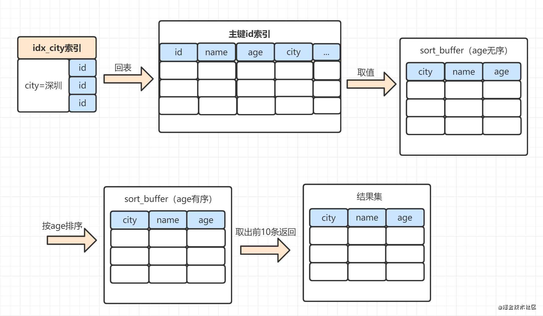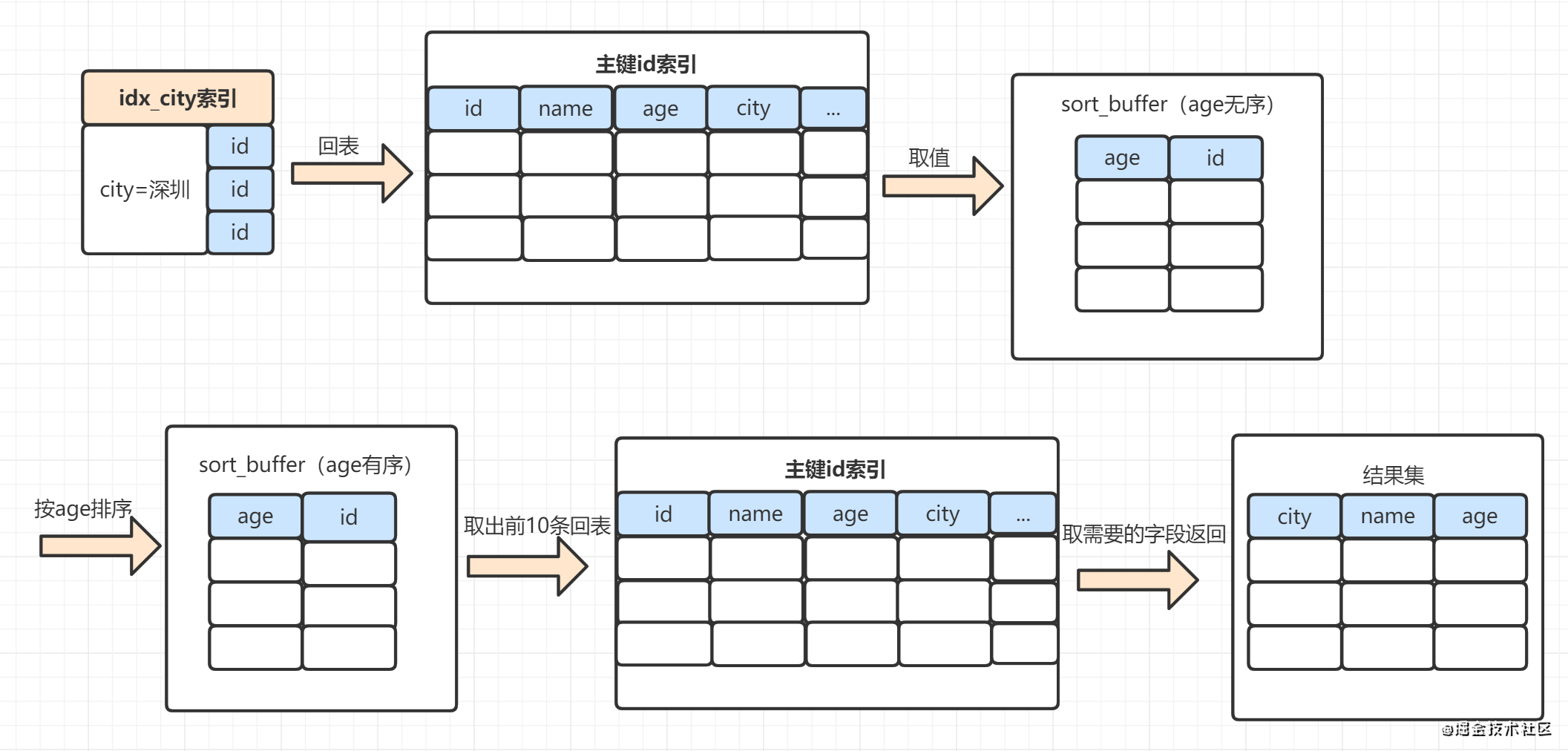 前面5步已经查找到了所有city为深圳的数据,在 sort_buffer中,将所有数据根据age进行排序;
