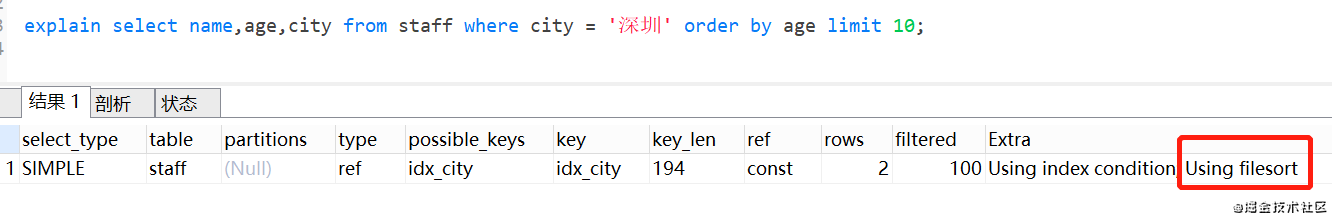 explain select name,age,city from staff where city = '深圳' order by age limit 10;