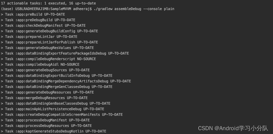 - –console plain 告诉 Gradle 打印出构建日志,就像您在 Android Studio 中看到的一样。提及这一点是完全可选的。