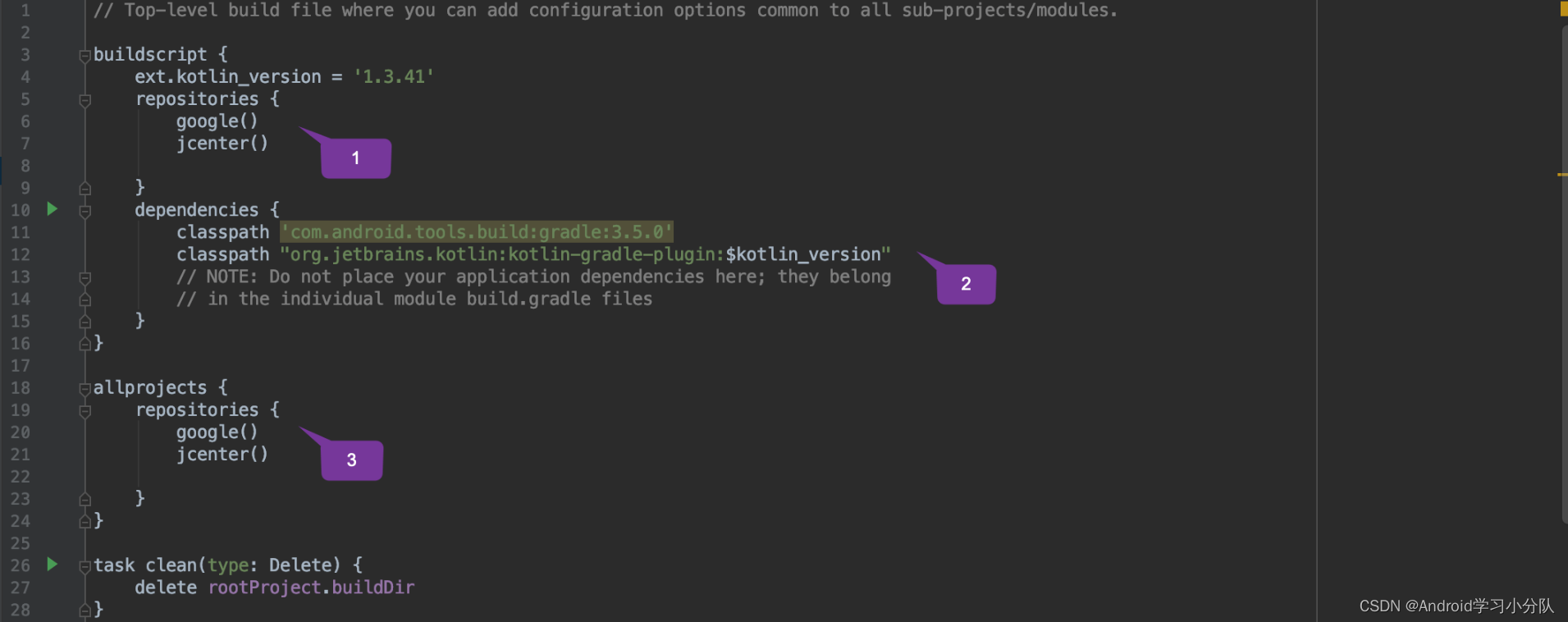 1.我们添加了所需的插件:android Gradle 插件以及所需的 kotlin 插件