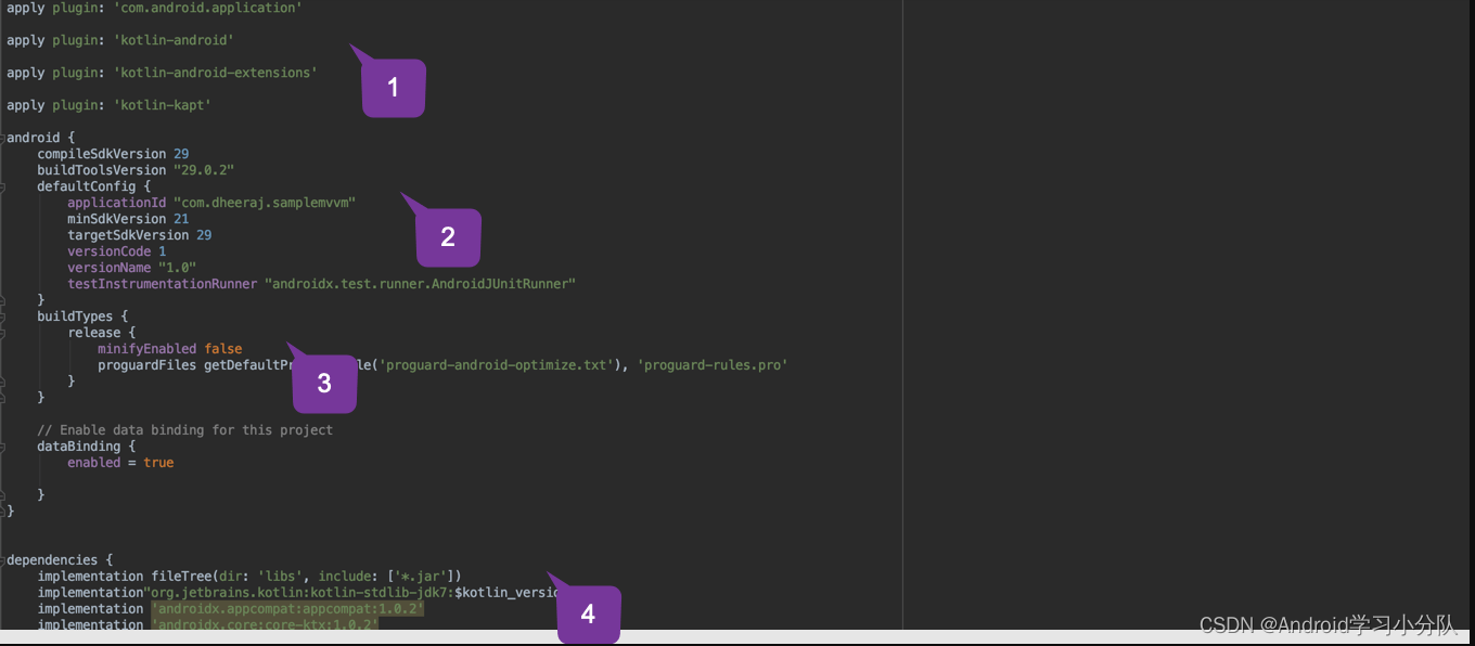 - 项目级别所需的依赖项(对所有子项目或模块有用)。我们可以看到整个项目都使用了 Gradle 依赖项和 kotlin依赖项,因此在这里(在项目级别)声明了它。