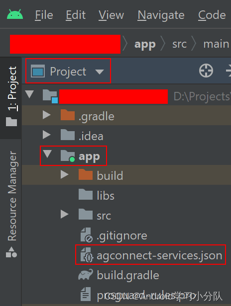 - 从App信息中下载agconnect-services.json文件,复制粘贴到app目录下的android Project中,如下。