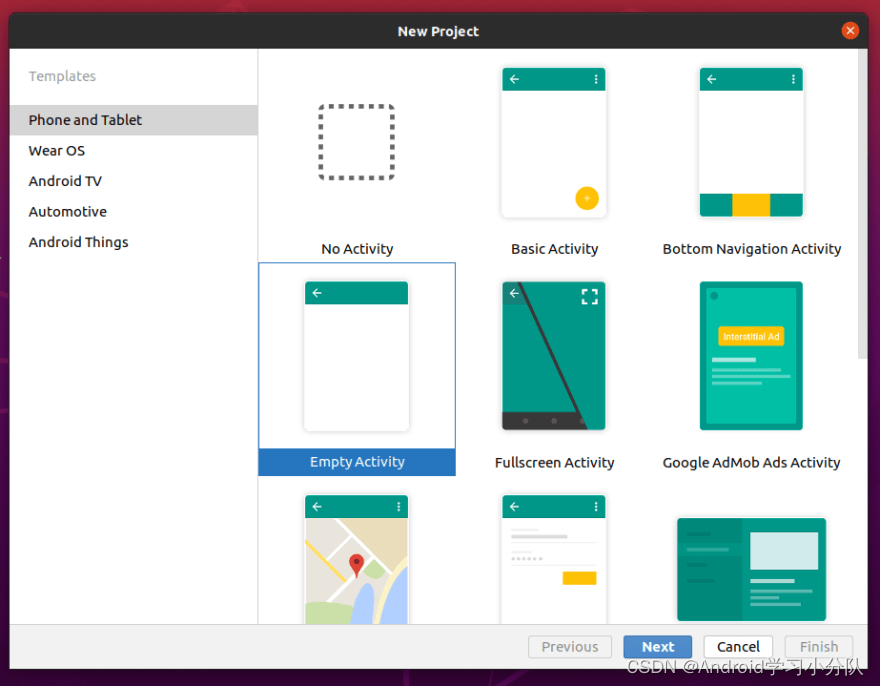 设置您的 Android 项目并选择Empty Activity Template。为您的项目命名,选择Android 6.0 (Marshmallow)作为您的最低 SDK,然后单击Finish。