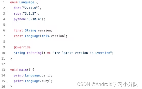 增强的枚举 当使用枚举时,我们现在可以提供额外的字段、方法、getter 和操作符。他们还可以实现接口并应用混入。基本上,他们几乎可以做一个班级可以做的所有事情。在枚举仅适用于我们的用例的情况下,这非常有用和灵活。