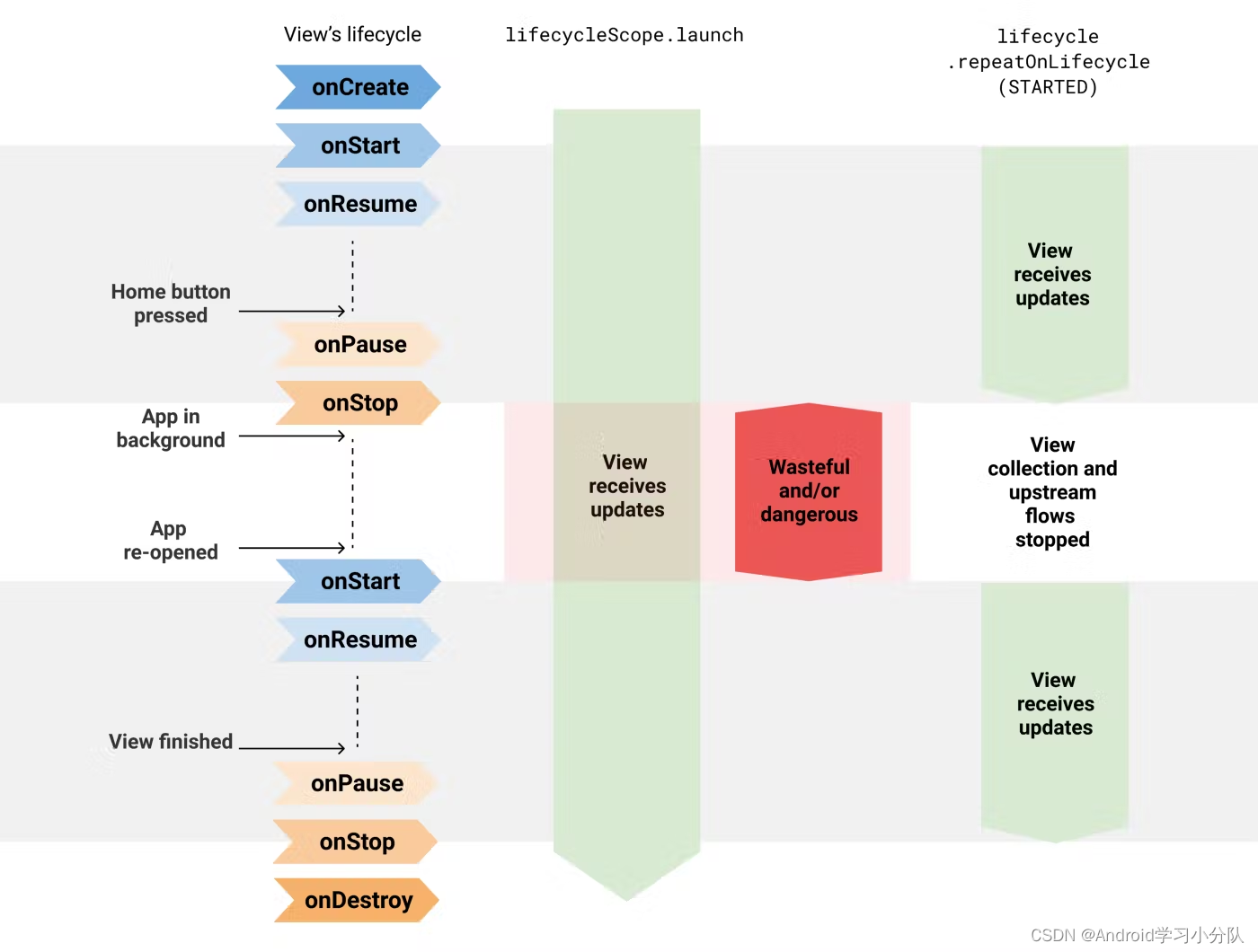repeatOnLifecycle 可以防止您浪费资源和应用程序崩溃,因为它会在生命周期移入和移出目标状态时停止并重新启动流收集。