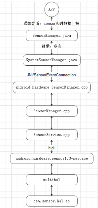Sensors Hardware Abstraction Layer(HAL)API是硬件驱动程序和Android框架之间的接口。它包含一个HAL接口sensors.h(hardware/libhardware/include/hardware/sensors.h)和一个被称为sensors.cpp的HAL实现。
