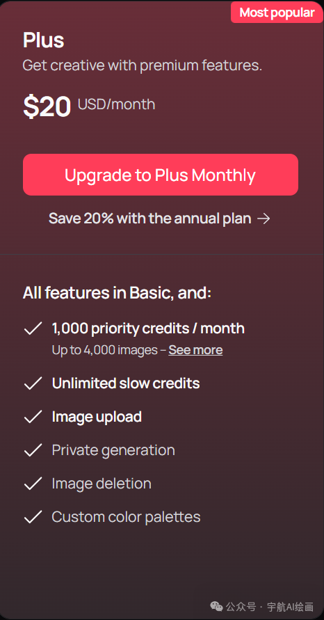 如果开通了Plus, 可以垫图,可以对生成的图片局部重绘,扩图,混合图片风格,还可以自定义色调。再来看下Plus价格,比MJ还便宜10美刀, 每月多达4000张快速生图,不限次慢速生图(我体验慢速生图比MJ快)。