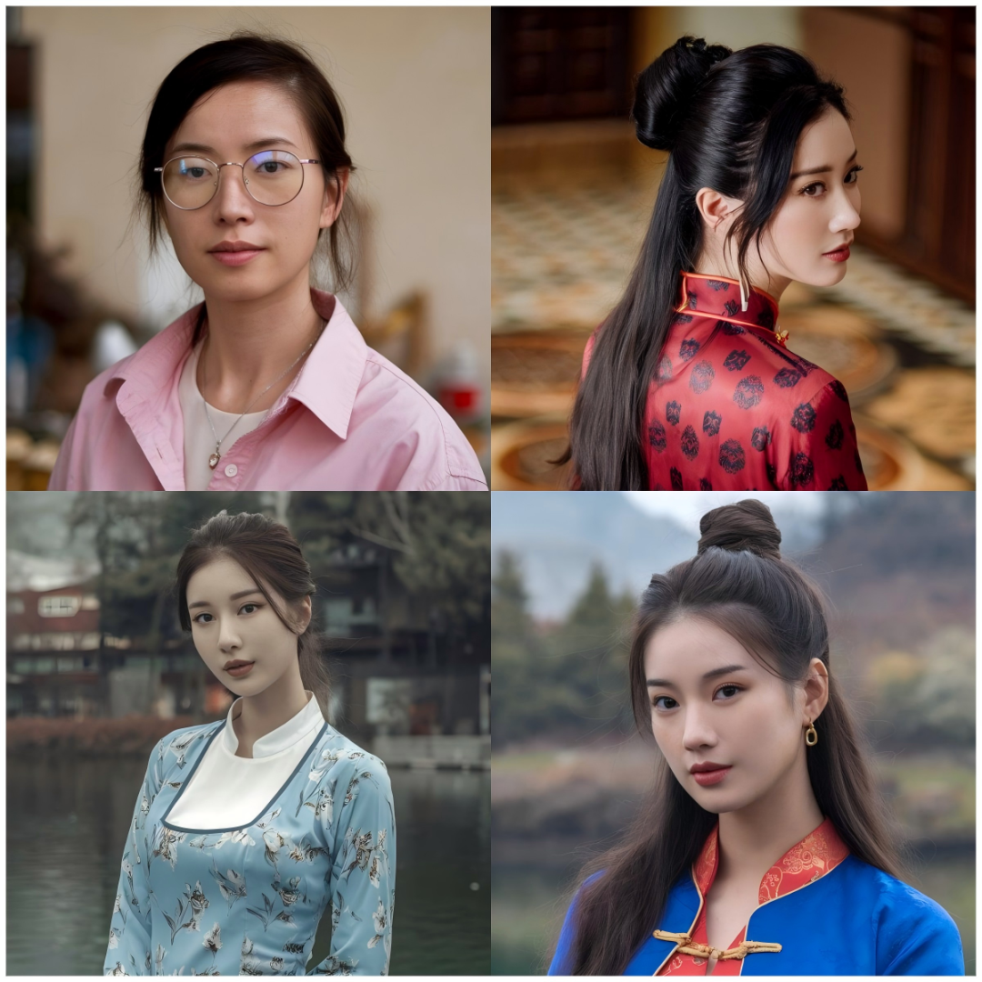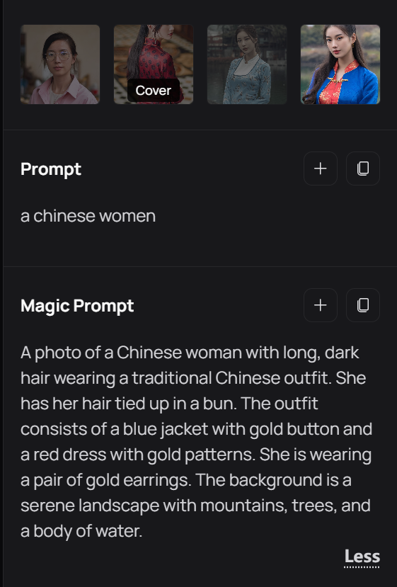 原本一句简单的提示词:“一个中国女人”,会被改成:“一张中国女性的照片,她有着长长的黑发,穿着传统的中国服饰。她的头发扎成一个髻。这套服饰包括一件蓝色夹克,上面有金色纽扣,以及一件带有金色图案的红裙。她佩戴着一对金色耳环。背景是一片宁静的山水风光,有山峦、树木和一片水域。”