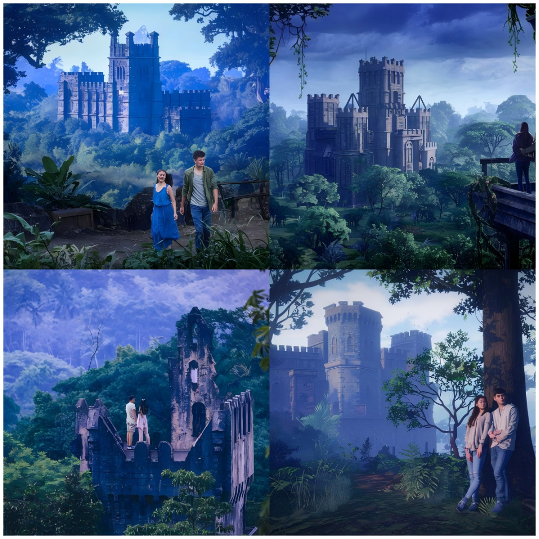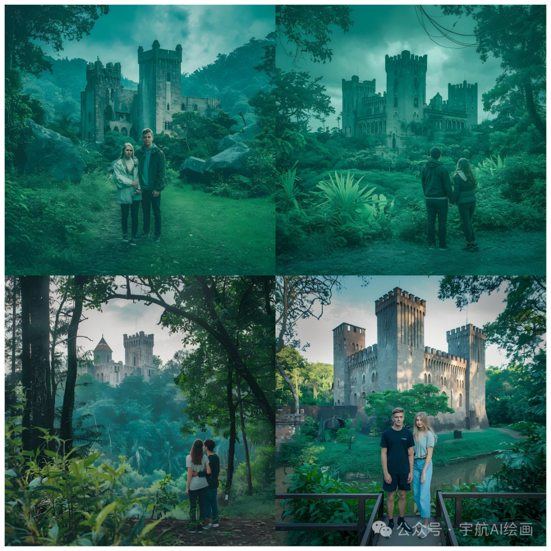 从林,古老的城堡,一对情侣, 我们选择绿色系
