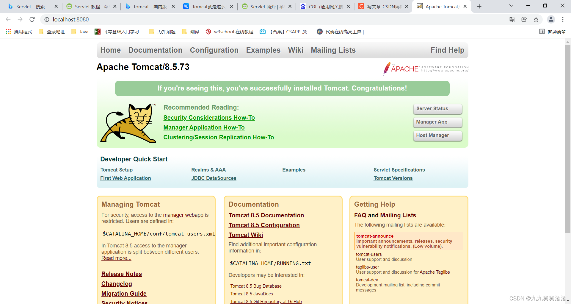 在浏览器地址栏输入http://localhost:8080,如果能够出现Tomcat页面,说明配置成功了!