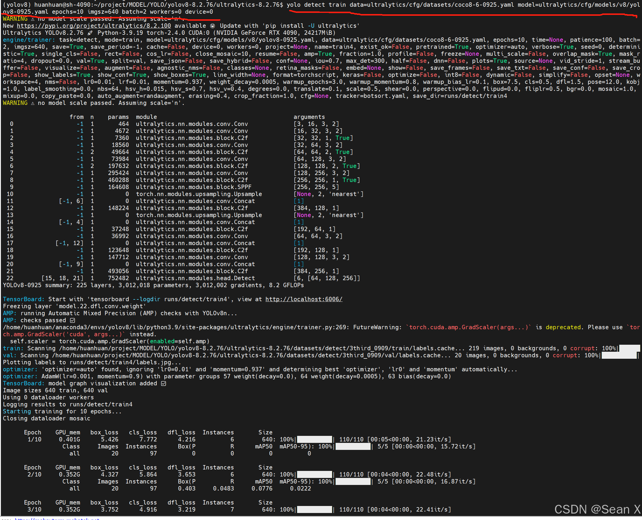 注意Linux下用正斜杠/,指令是yolo detect train data=ultralytics/cfg/datasets/coco8-6-0925.yaml model=ultralytics/cfg/models/v8/yolov8-0925.yaml epochs=100 imgsz=640 batch=2 workers=0 device=0