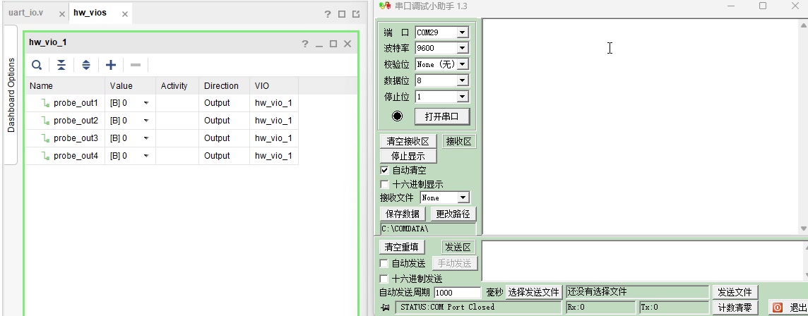 对System Generator算法进行板级验证,需要快速搭建算法外围测试电路。通过vio控制和串口助手,可以将需要处理的数据提前存入FPGA的ram中,再控制算法运行,将结果通过串口输出。