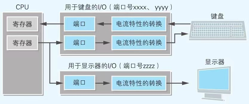 I/O控制器中有用于临时保存输入输出数据的内存,这个内存就是端口;I/O控制器内部的内存也称为寄存器,但和CPU内部寄存器在功能上是不同的,CPU内部寄存器用来处理数据运算的,而I/O寄存器用来临时存储数据的;