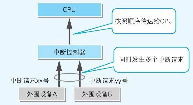 实施中断请求的是连接外围设备的I/O控制器,负责实施中断处理程序的是CPU;