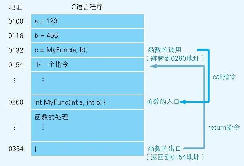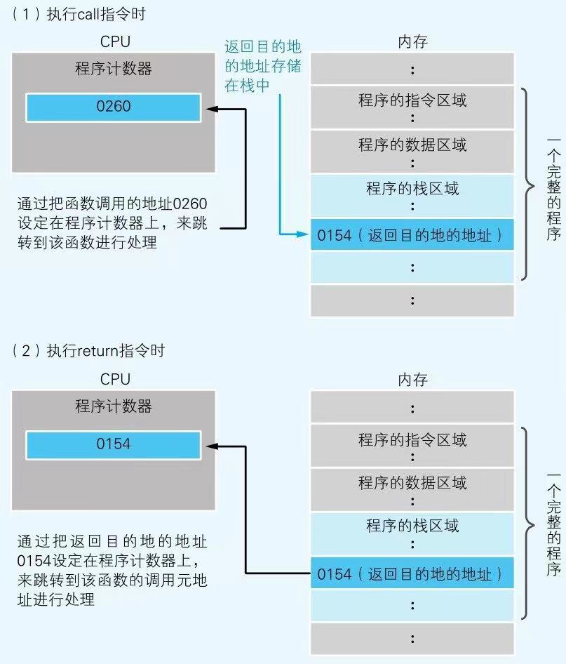 函数调用使用的是call指令,而不是跳转指令,call指令会把调用函数后要执行的指令地址存储在名为栈的主存内,return命令的功能是把保存在栈中的地址设定到程序计数器中;