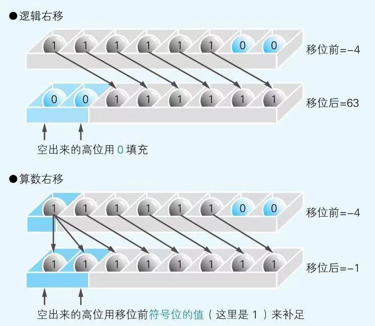 算术右移:二进制数作为带符号的数值进行运算时,移位后在最高位填充移位前符号位的值(0或1),数值是用补数表示的负数值,右移后在空出来的最高位补1,可以实现1/2,1/4,1/8等的数值运算,如果是正数,只需在最高位补0即可;