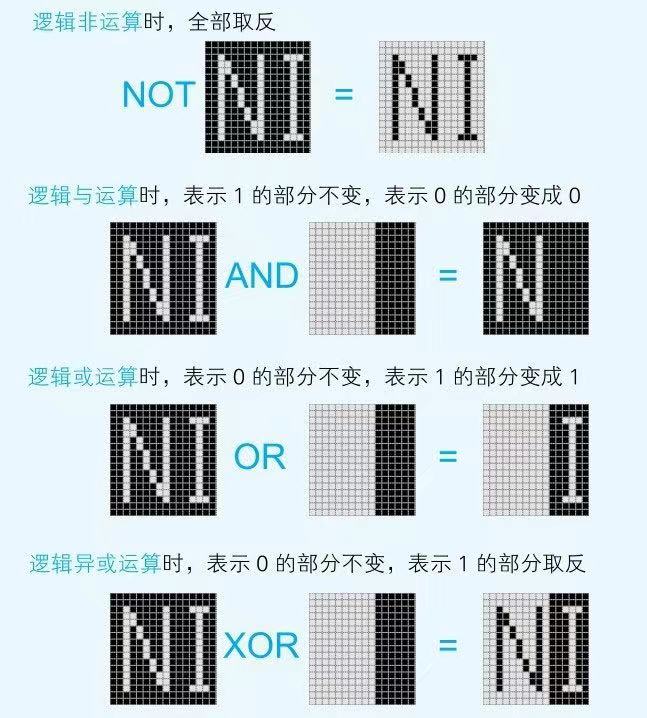对图形模式进行4种逻辑运算的结果(白色表示1,黑色表示0)