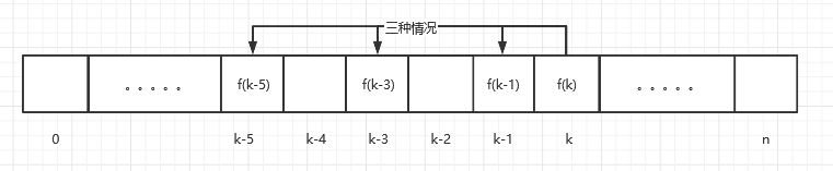 比如我们定义现在的情况是f(k),那么他的前一步,就可能是f(k-1),f(k-3)和f(k-5)三种情况我们笼统的定义为f(k-i)