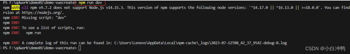 仔细阅读报错信息发现,是因为没有Script脚本"dev"而报错,让你看看script列表然后再运行npm run命令。