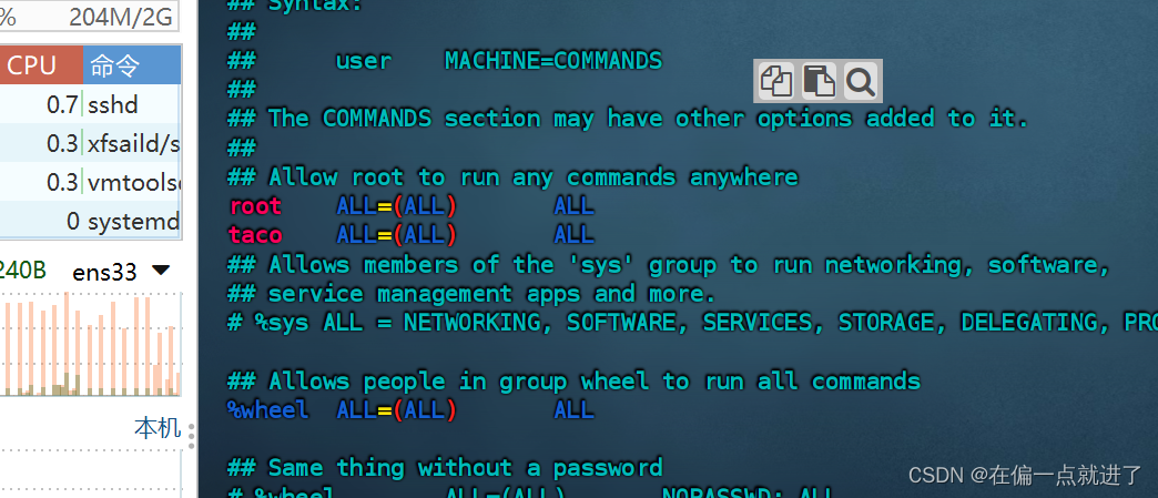 - vim /etc/sudoers