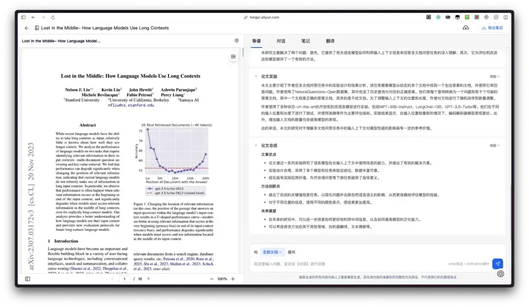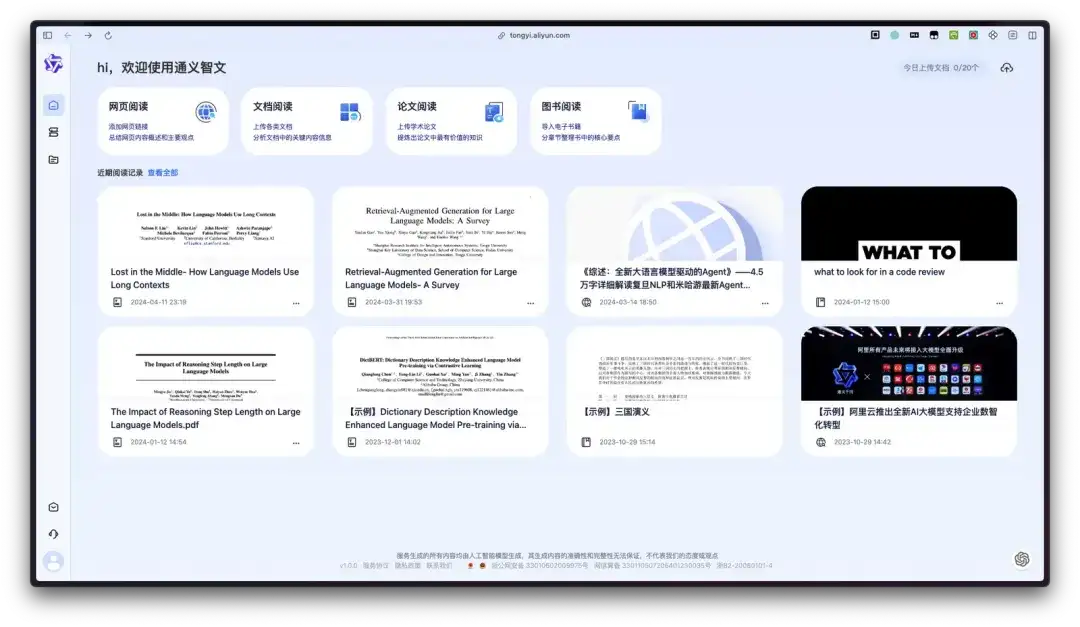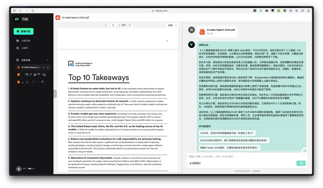 我们可以使用万知、通义智文 或者其他类似的平台,如天工AI阅读、 ChatPDF 、PDF ChatBot等。直接和文档、网页、论文、图书对话。