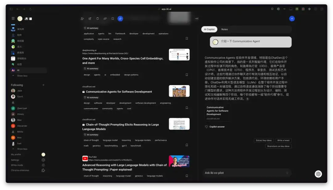 学习某个技术文档太多,解决某个问题时找到对应的知识点非常费劲,可以直接将文档扔进去,相关问题直接提问即可。注意:禁止将公司内部的文档传到外网,可以尝试将一些公开的外部的技术文档放进去。AI时代,类似iki.ai这样的智能的个人和团队知识库应运而生。