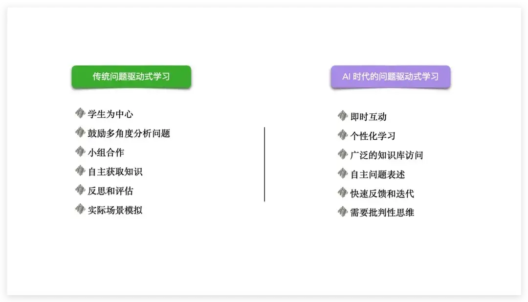 传统的问题驱动式学习更强调解决问题,AI时代的问题驱动式学习提出问题和解决问题并举。