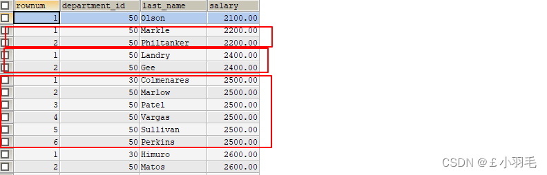 SELECT row_number() over(PARTITION BY salary) rownum, department_id, last_name, salary