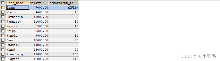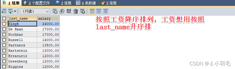 #按照工资降序排列,工资相同则按照姓名升序排列 SELECT `last_name`,`salary` FROM `employees` ORDER BY `salary` DESC, `last_name` ASC;