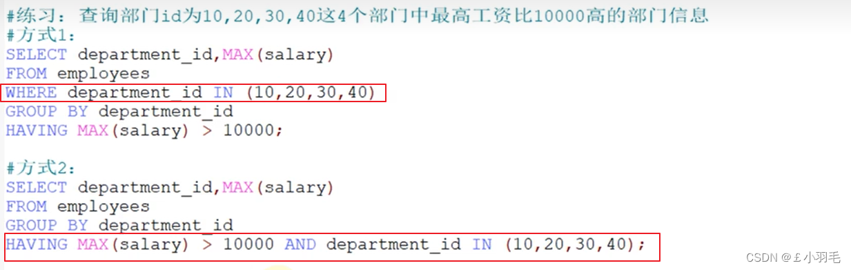 2.过滤条件中没有聚合函数时,则过滤条件声明在WHERE或HAVING中都可以。但是建议写在WHERE 中。WHERE的执行效率要高于HAVING。