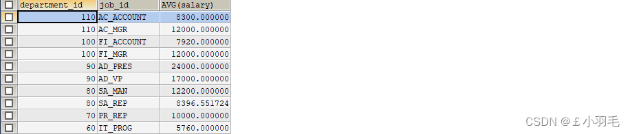 多列分组,查询各个部门每个工种的平均工资。