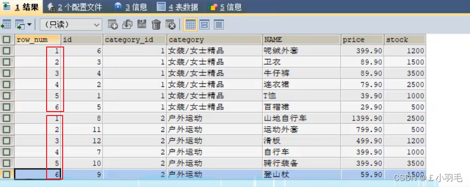 结果解析:不同于GROUP BY,窗口函数并没有把分类id相同的捏成一行。只是把分类相同的行记录放在了一个分区内,并且同一个区内的行记录按照价格降序排列,OVER之后,给这波数据加个序号列,别名起为 row_num