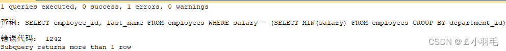 #列的别名在where中使用会报错 SELECT `last_name`,`salary` ,salary * 10 sals FROM `employees` WHERE sals>100;报错如下:Unknown column 'sals' in 'where clause'