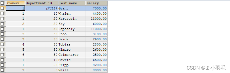 SELECT row_number() over(PARTITION BY department_id ORDER BY salary DESC) rownum, department_id, last_name, salary