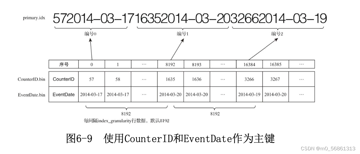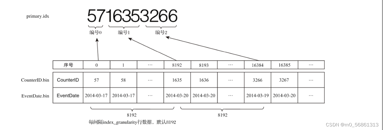 每隔索引粒度行,取主键id生成一个索引值。下图是索引粒度为8192且主键为counterID。