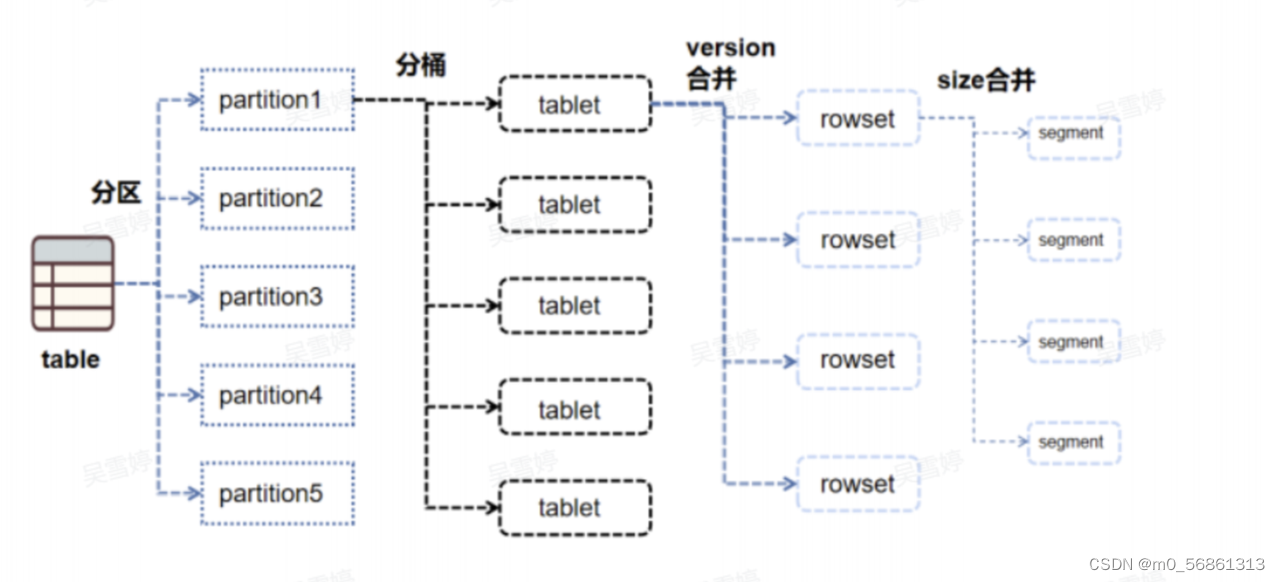 rowset类似ck每次写入会创建一个分区目录例如rowsetm_m后续然后会定期合并成rowsetm_n。会有参数控制rowset大小,到一定程度会拆分成两个