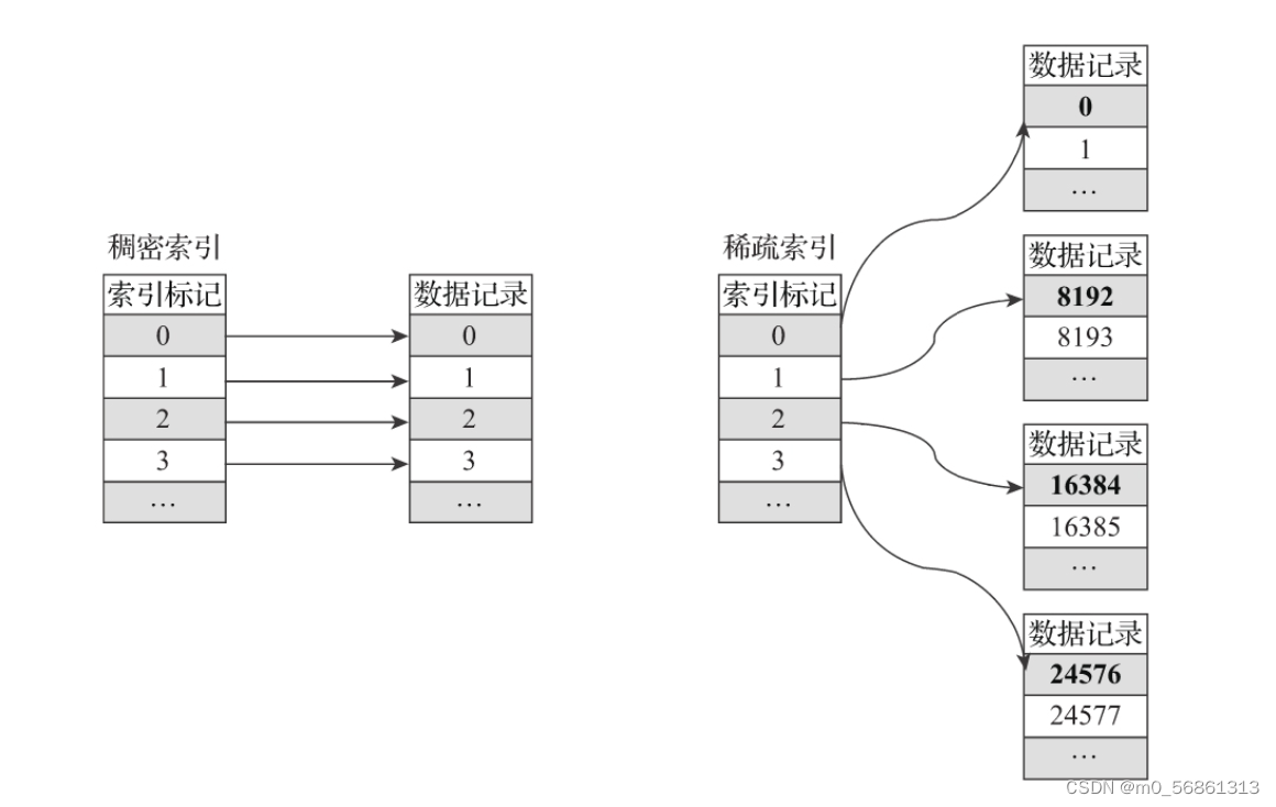 ClickHouse中索引均是采用稀疏索引存储的。我们平时使用mysql使用的是稠密索引一个索引标记对应一条记录