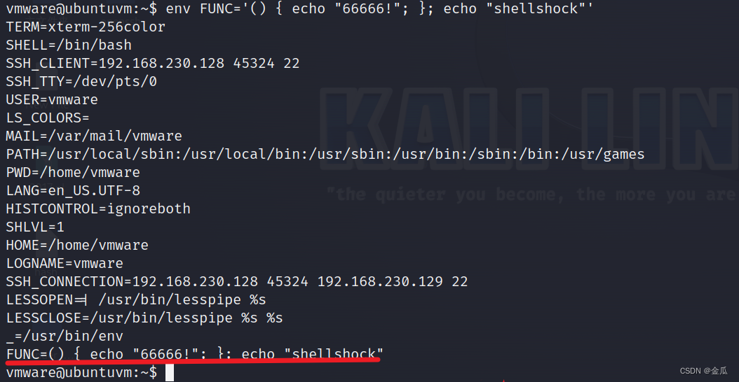 学习笔记 | Shellshock漏洞利用提权 在Shellshock漏洞中,攻击者可以通过在环境变量中插入恶意代码,例如函数定义,然后触发Bash解释器执行这些代码。这是因为Bash解释器在解释环境变量时,并不仅仅是将变量的值替换为文本,而是会尝试解释其中的特殊字符和命令。Bash解释器在解释环境变量时,不仅仅是简单地替换变量的值,它还会对变量的内容进行解释,包括其中可能存在的特殊字符和命令。然后,如果有任何触发条件,比如执行后面的命令时,Bash会执行这个恶意函数,并输出语句。借助漏洞利用的脚本直接更改脚本内容,发现不行,我不会改perl语言。