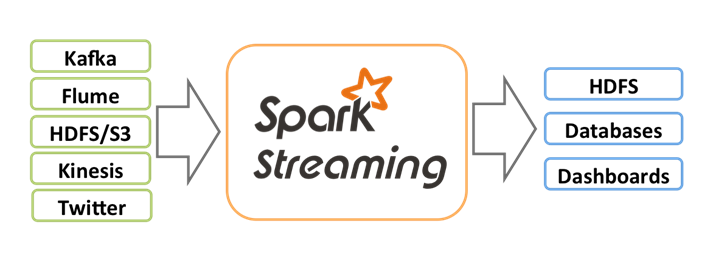 - 支持从多种数据源获取数据,包括Kafka、Flume、Twitter、ZeroMQ、Kinesis以及TCP sockets,然后可以使用诸如map、reduce、join等高级函数进行复杂算法的处理,最后可以将处理结果存储到HDFS文件系统,数据库等。