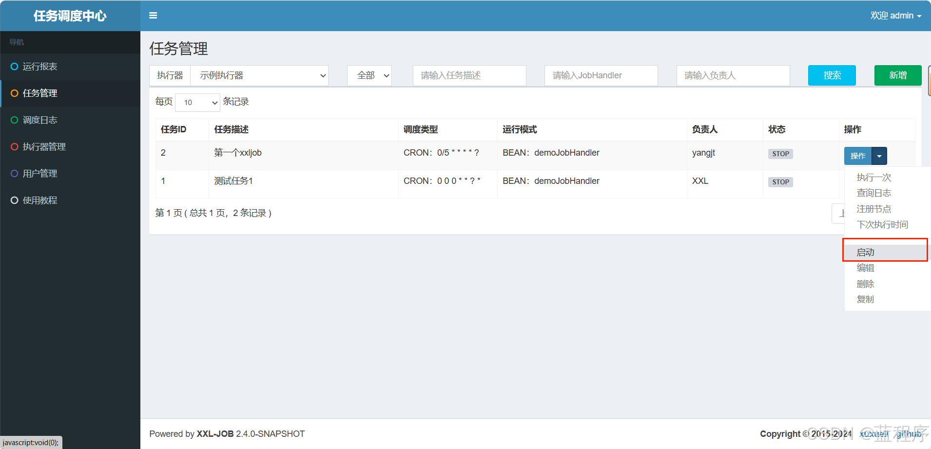 上节下载的代码其实已经为我们写好了一个执行器项目:这节我们手动完成执行器项目:选择maven管理,这里我选择的jdk1.8 spring boot 版本选择的是 2.7.6执行器配置添加执行器配置方法 添加job处理类 使用@XxlJob注解 属性起一个名字:demoJobHandler记住这个名字 后面添加任务时需要填写这个名字运行启动类,本地运行运行后打开任务调度中心,在任务管理中新增一个任务:这里选择执行器为示例执行器,配置任务描述和负责人,设置触发时间,这里设置每五秒