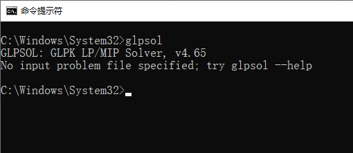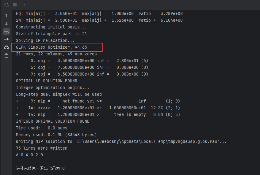 5、正确安装配置GLPK,将得到以下运行结果,显示调用GLPK求解器